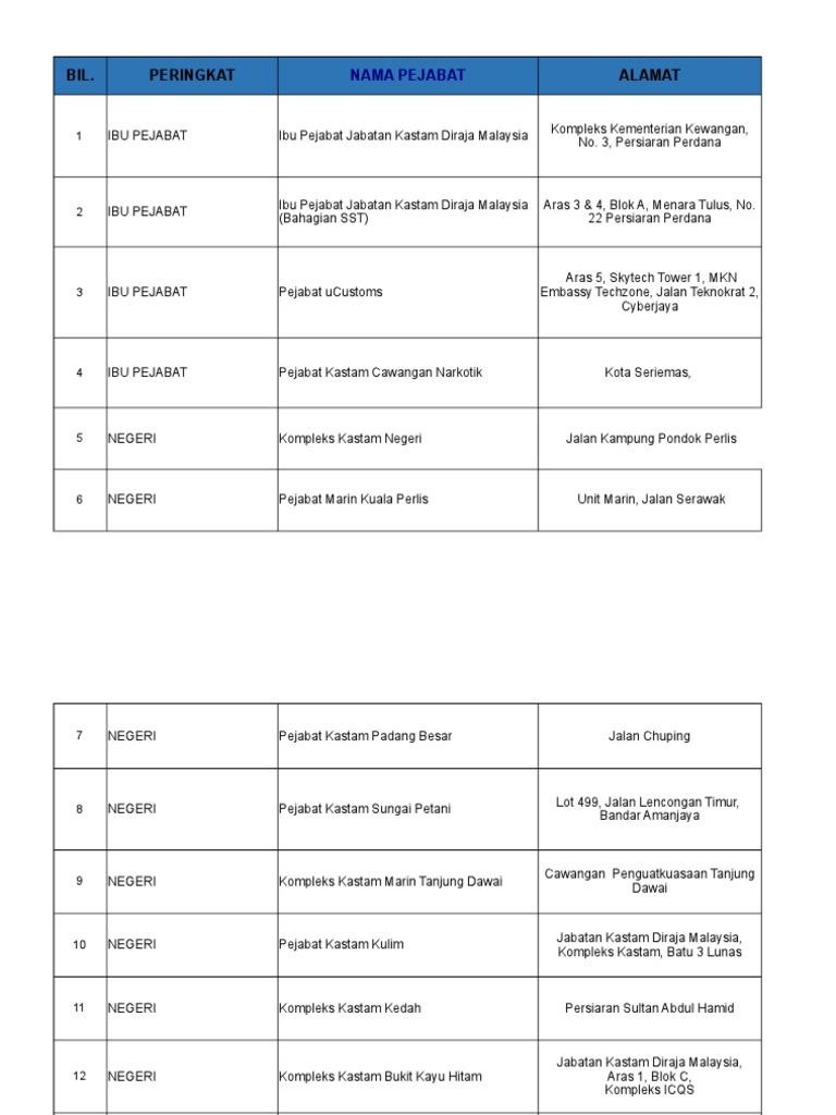 18senarai Pejabat Kastam Di Seluruh Malaysia Pdf